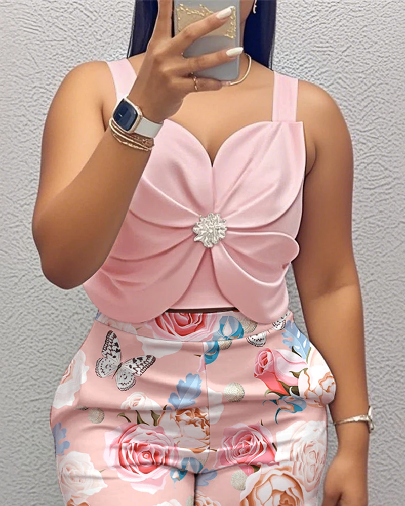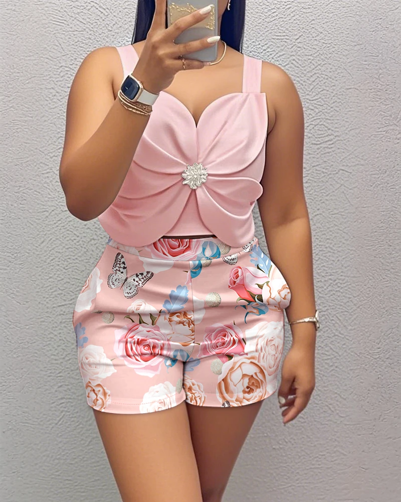 2-delige set van 3D-bloemen dikke horlogebandjes met strass-versiering, overhemd gesneden vest en casual shorts met bloemenprint, met zakken