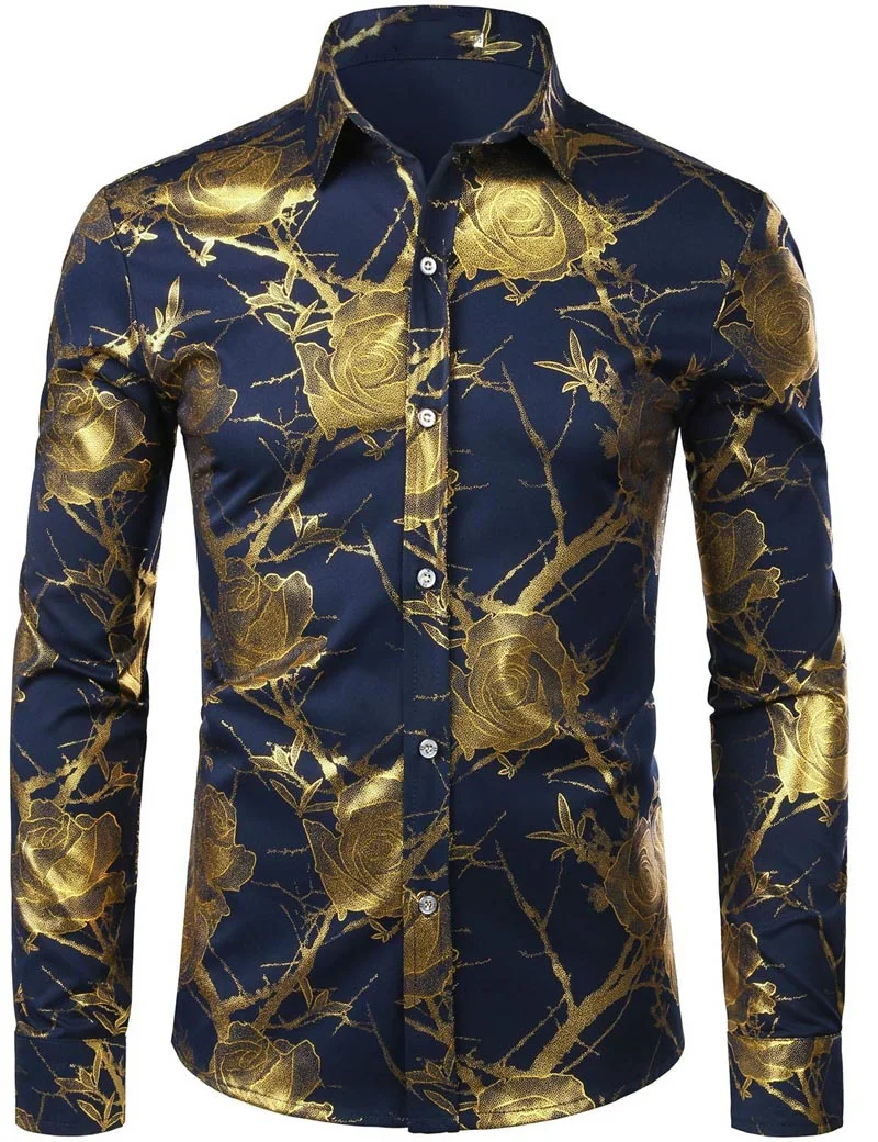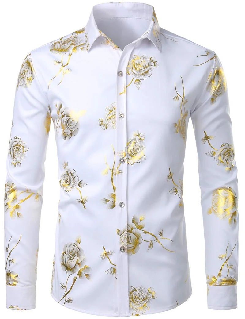 Luxe gouden formele herenoverhemden met lange mouwen, bloemenprint, knop, herenoverhemd, 2025, lente, modetrend, avondfeest, dinerblouse