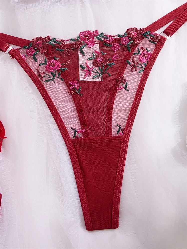 Bloemenlingerieset Mooi vrouwelijk ondergoed Luxe borduurbeha-sets Romantisch bordeauxrood mesh-ondergoed Doorzichtige lingerie