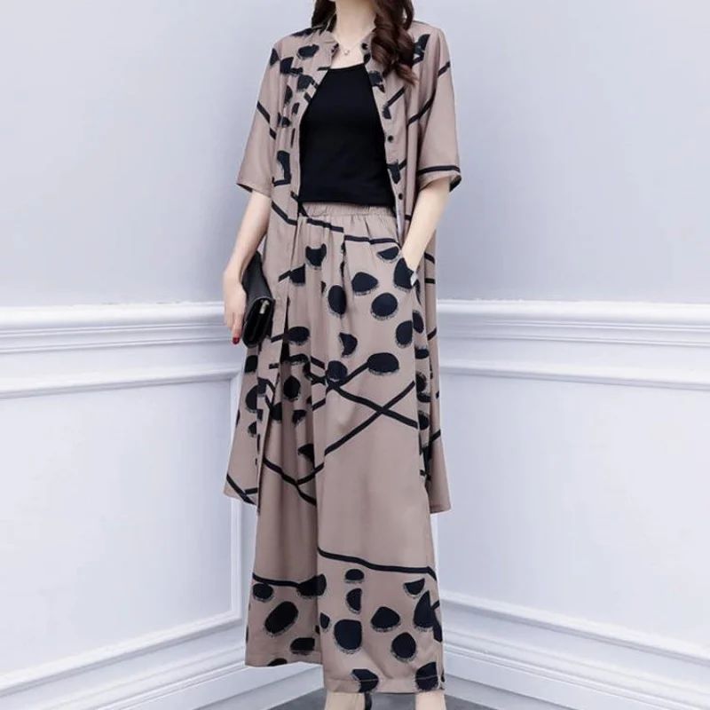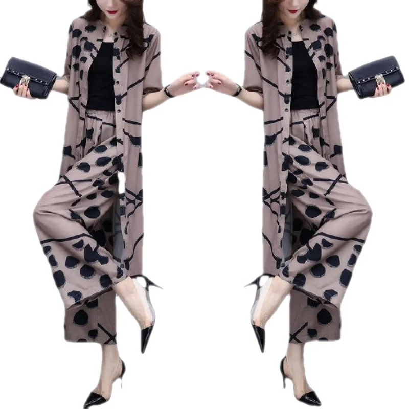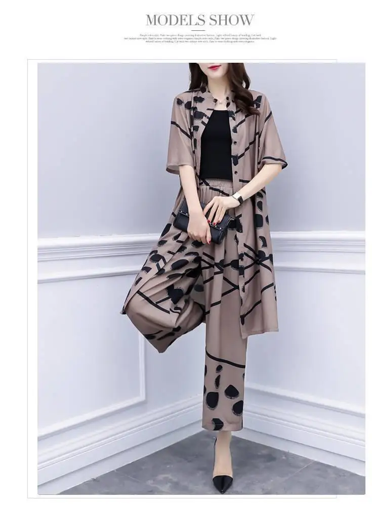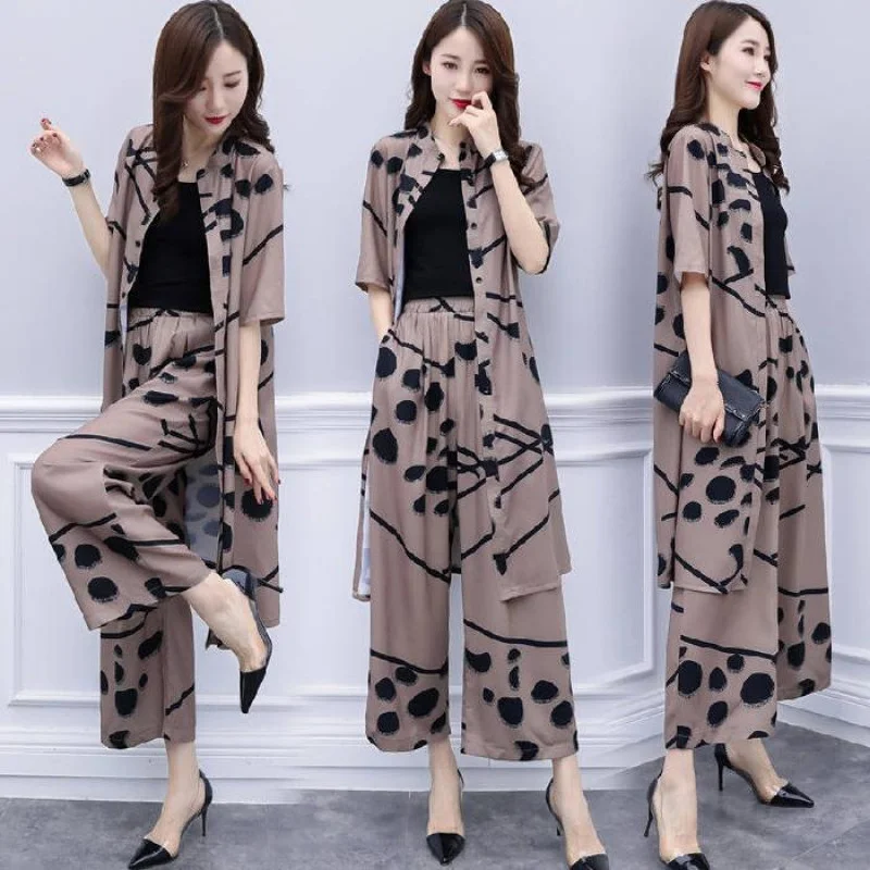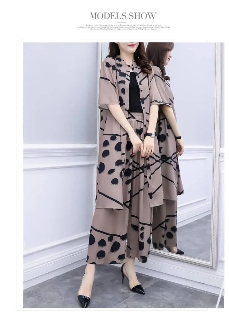 Dames zomer 2025, nieuwe Koreaanse stijl, casual plus size chic chiffon vest, top en wijde pijpen broek, mode tweedelige set quantity