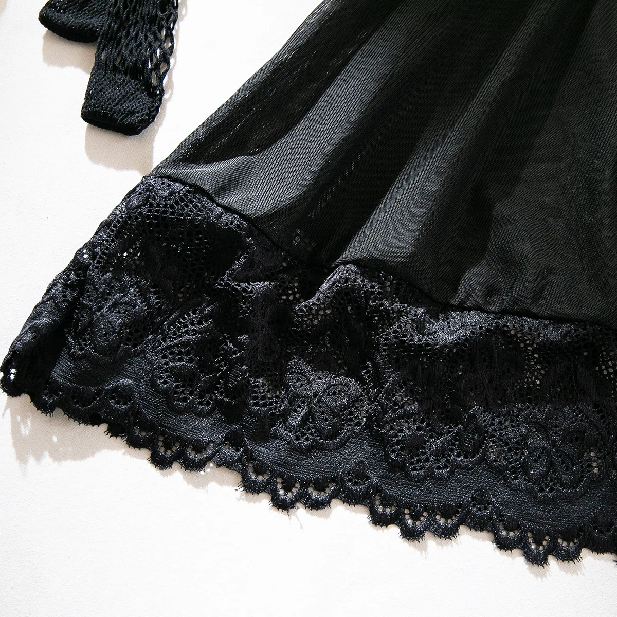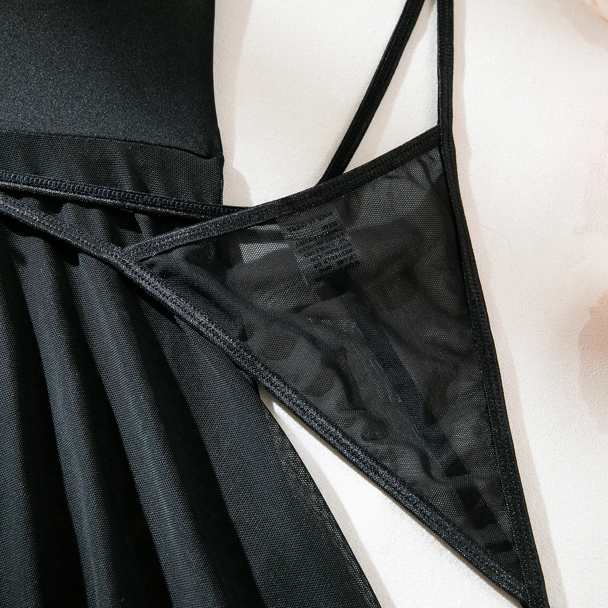 Een set sexy driedelige set met netkousen, ondergoedset, ondergoed, nachtjapon, kanten splitsen, kanten vormgevend ondergoed