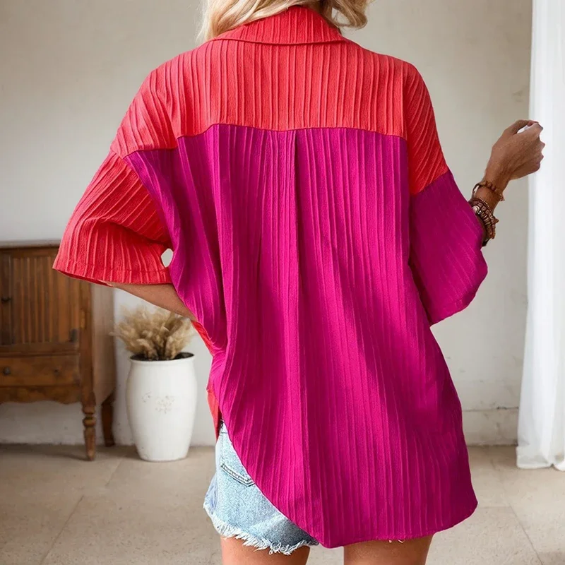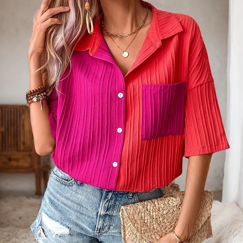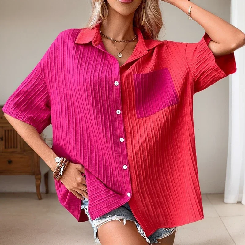 / Fashion Chic Single-breasted Shirt Casual Loose Turn Down Collar Contrast Color Stitching Pocket Short Sleeve Shirt For Women