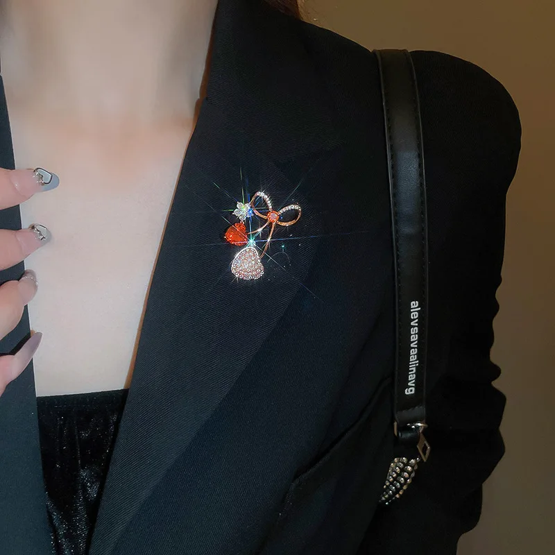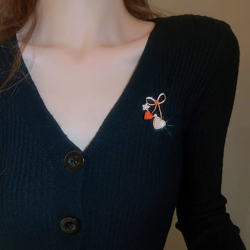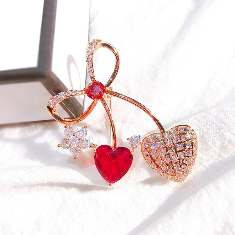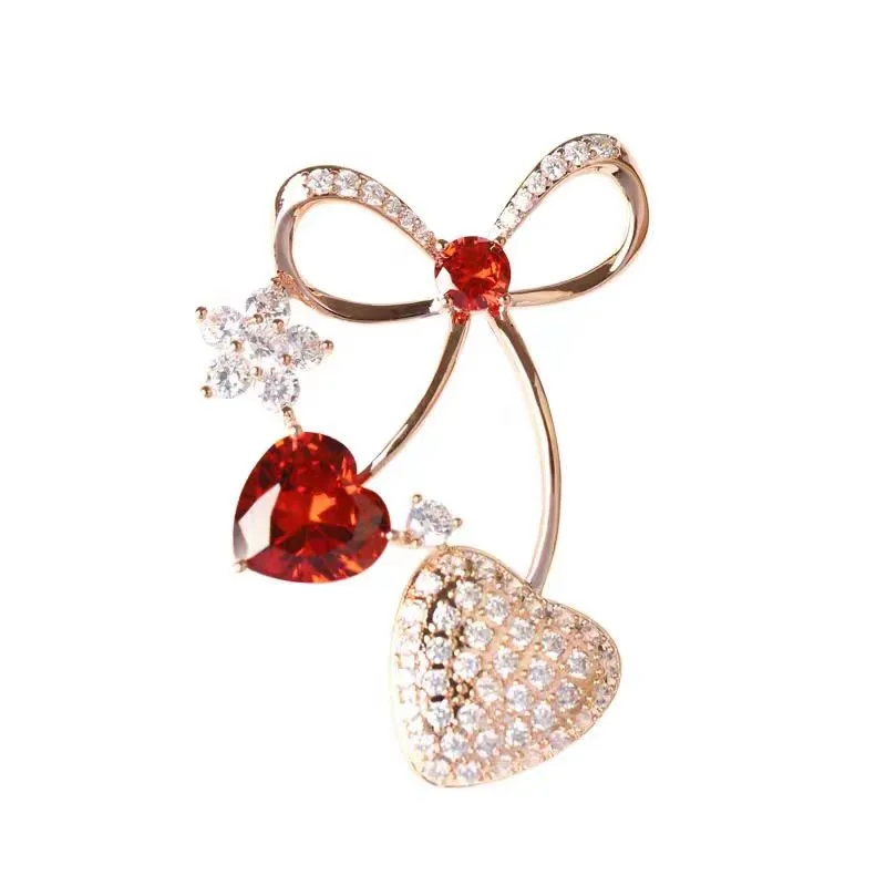 Glanzend Strass Rode Liefde Hart Cherry Broches Pin voor Vrouwen Meisjes Strik Corsage Kleding Accessoires