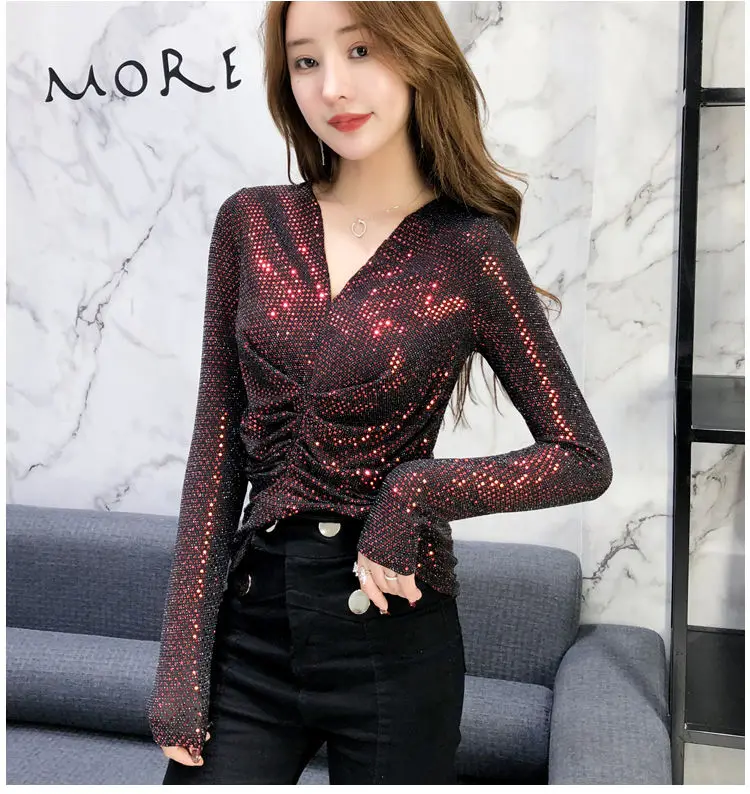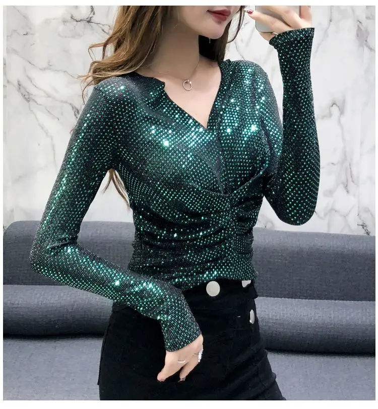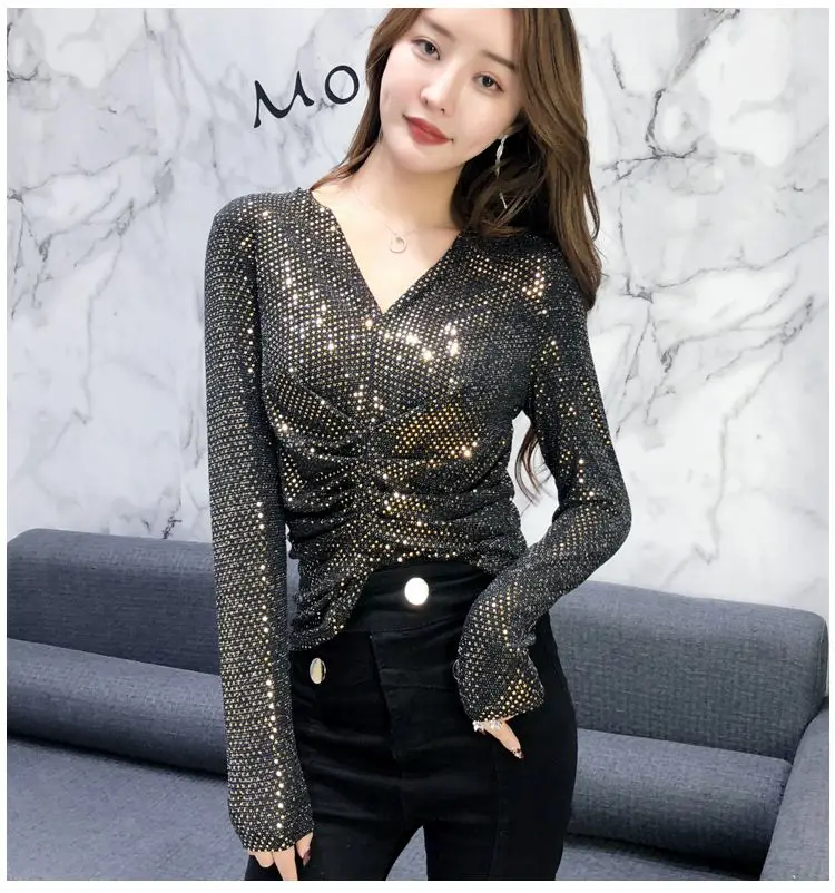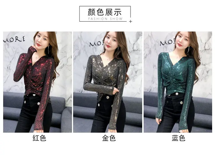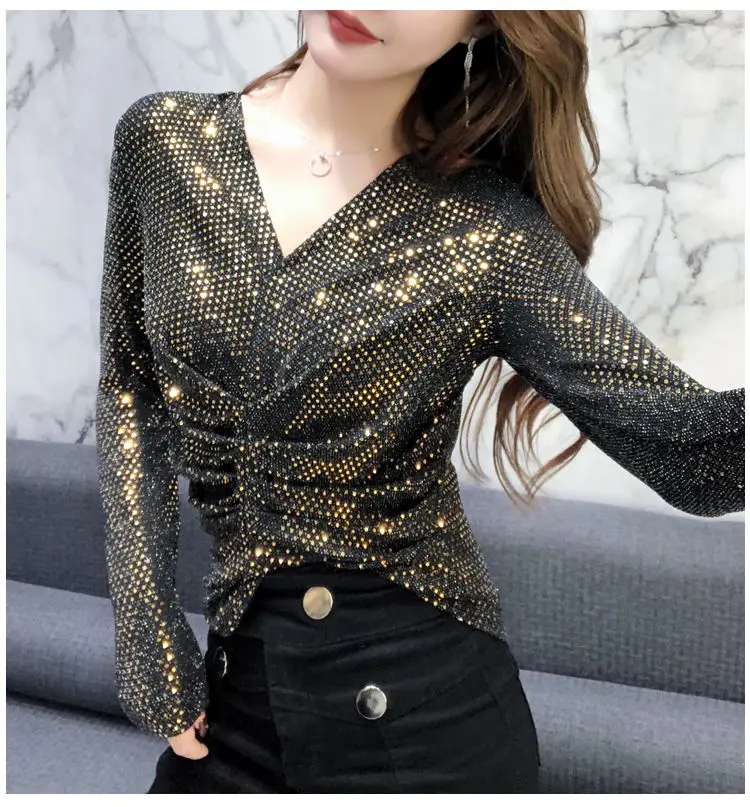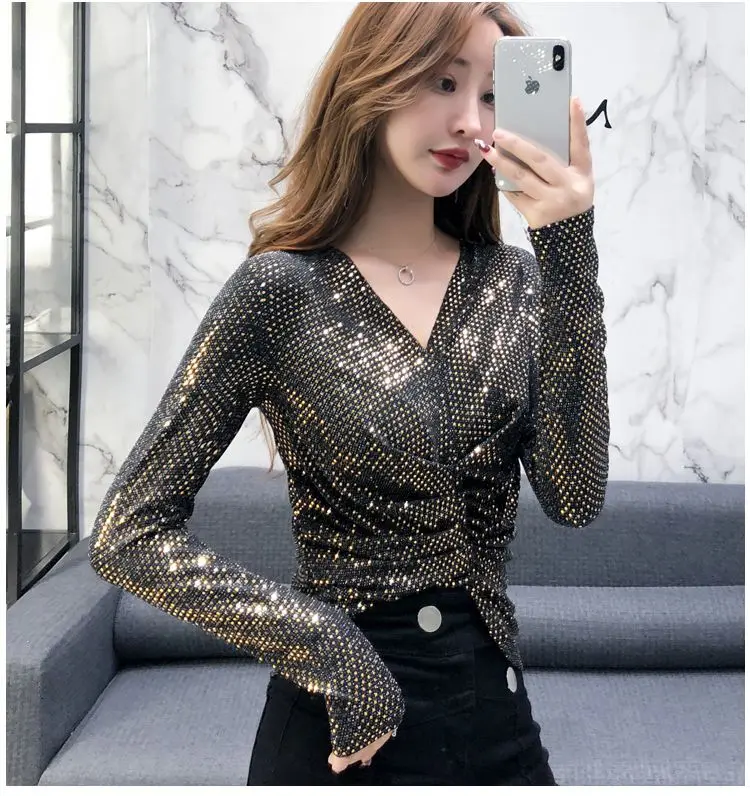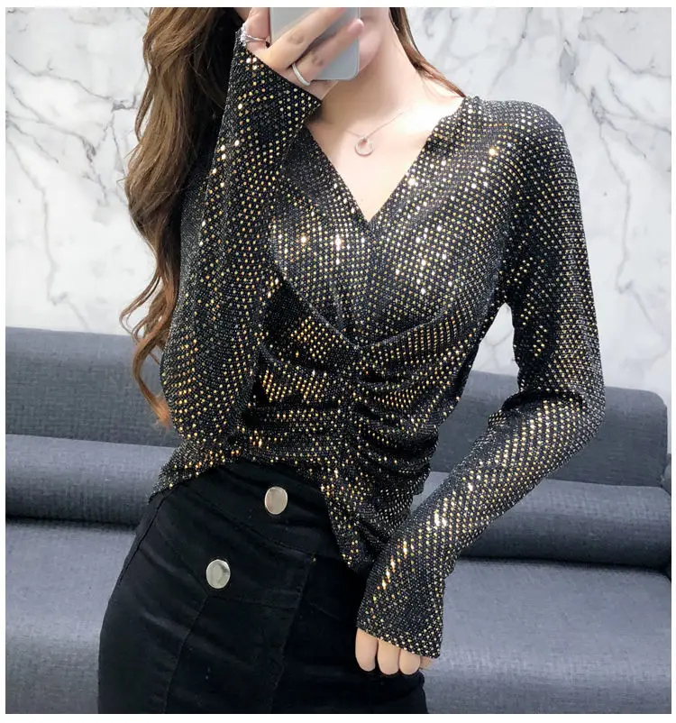 Luxe Glanzende Pailletten Lente Herfst T-shirt Sexy Slim Crop Tops Vrouwen Y2k Geplooide Tees Lange Mouwen Party Design Chic Streetwear quantity