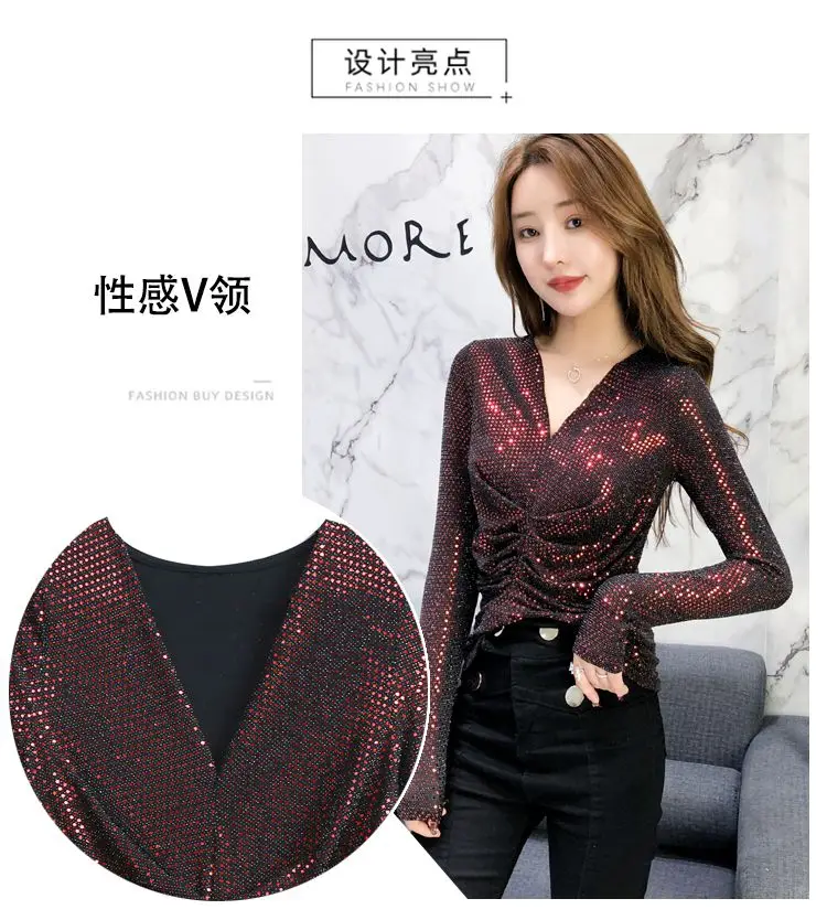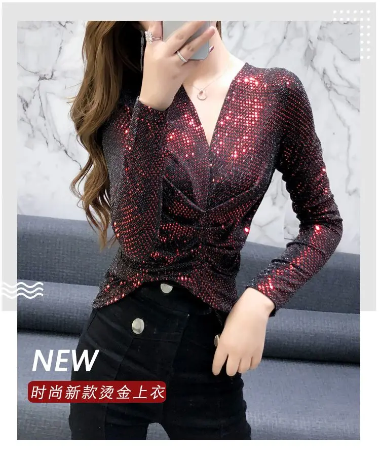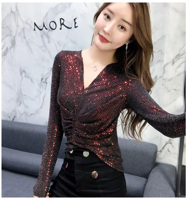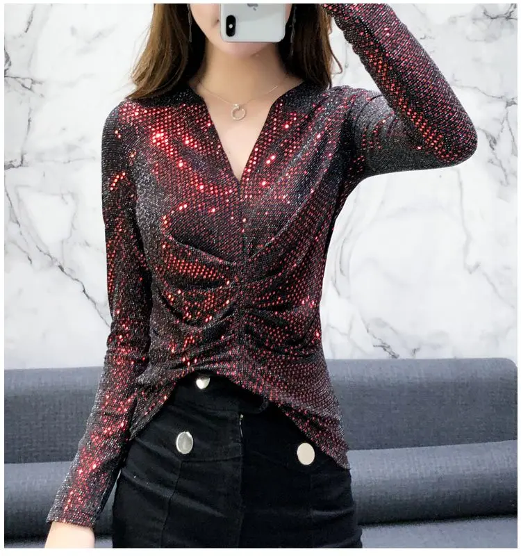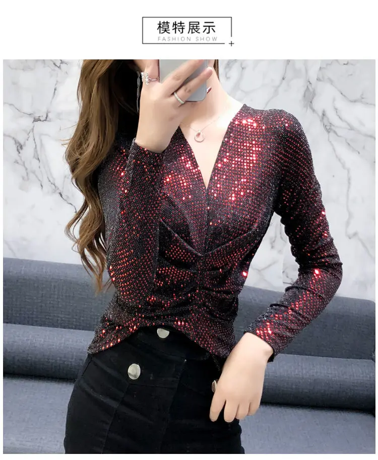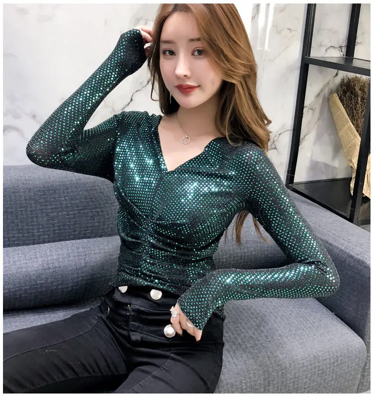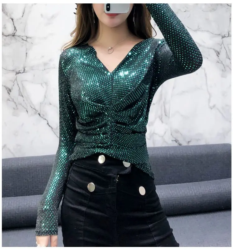 Luxe Glanzende Pailletten Lente Herfst T-shirt Sexy Slim Crop Tops Vrouwen Y2k Geplooide Tees Lange Mouwen Party Design Chic Streetwear quantity