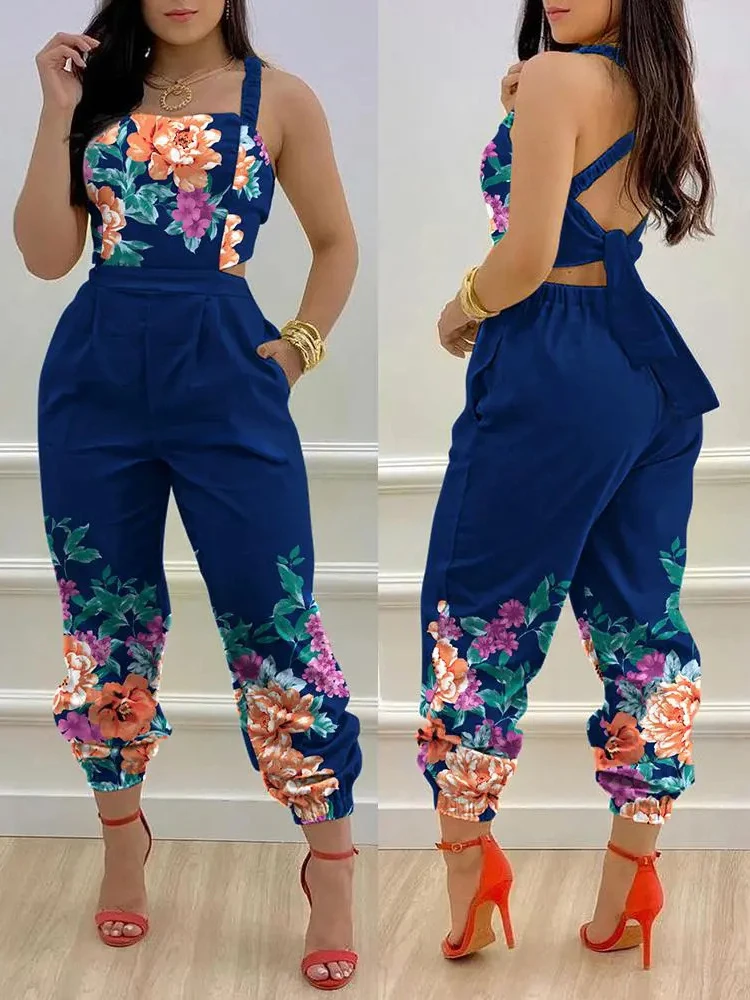 / Nieuwe zomermode bedrukte mouwloze jumpsuit sexy holle backless lange jumpsuits met veters elegante casual jumpsuit met zak
