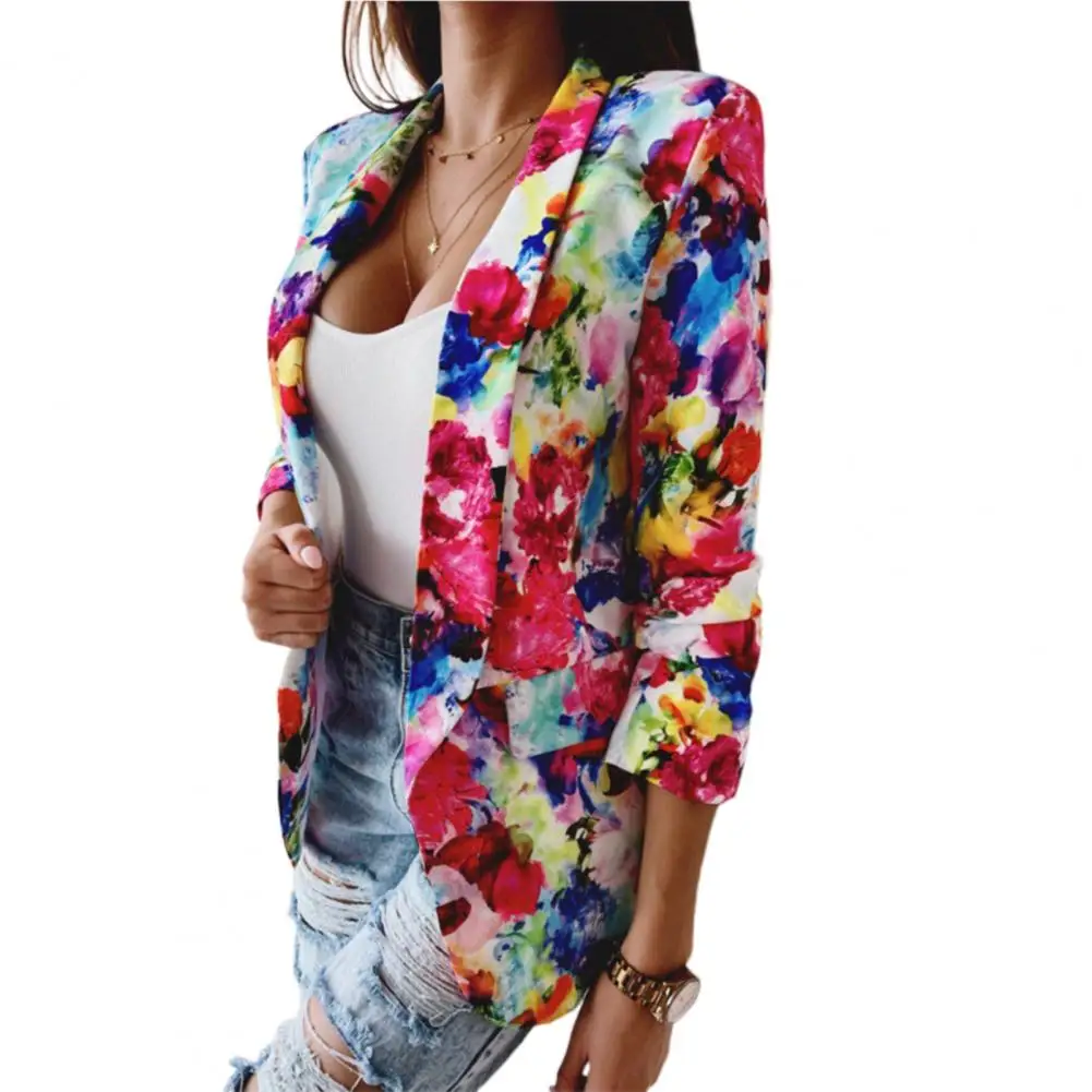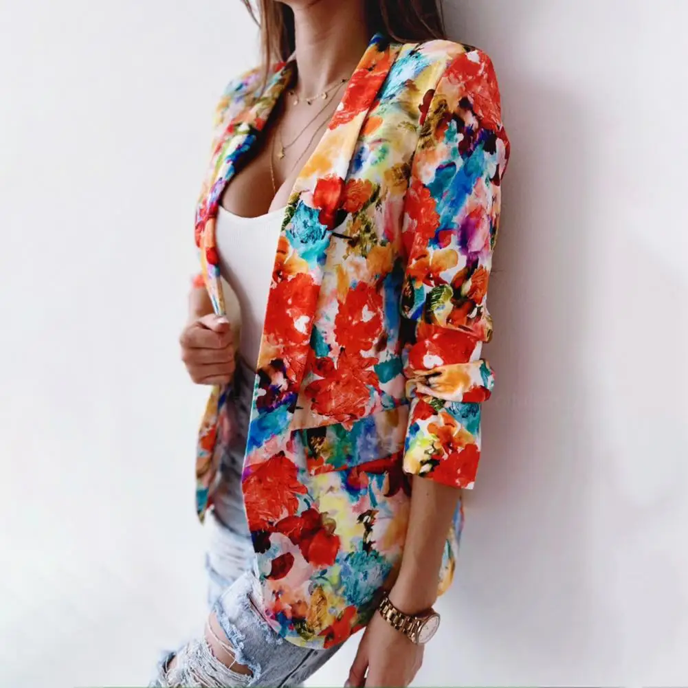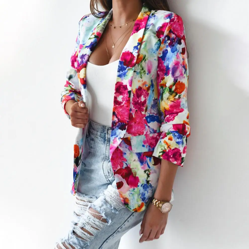 Office Lady Blazer Colorful Print Slim Spring Autumn Fake Pockets Floral Suit Jacket for Office