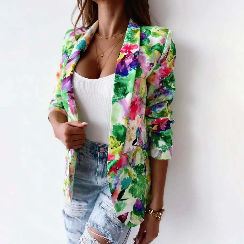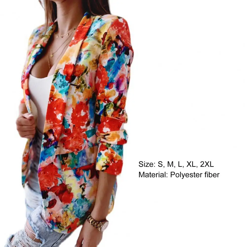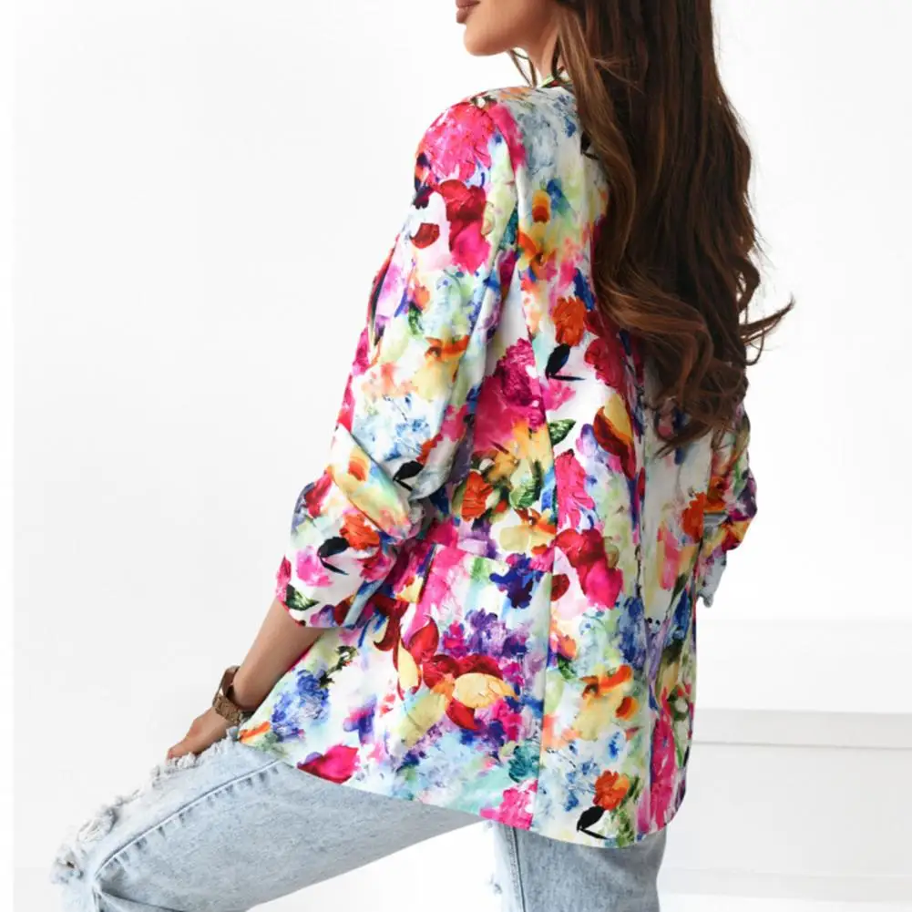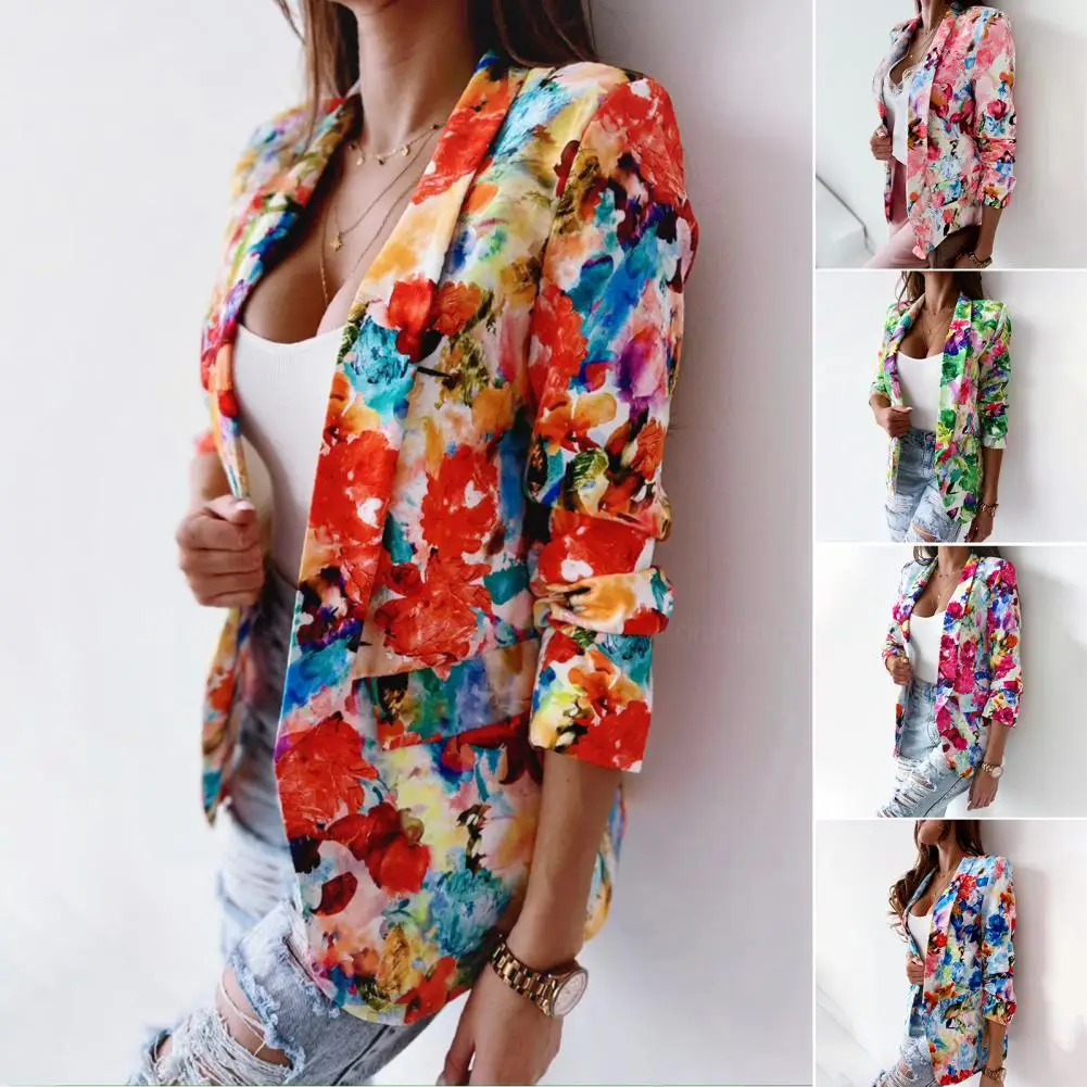 Office Lady Blazer Colorful Print Slim Spring Autumn Fake Pockets Floral Suit Jacket for Office