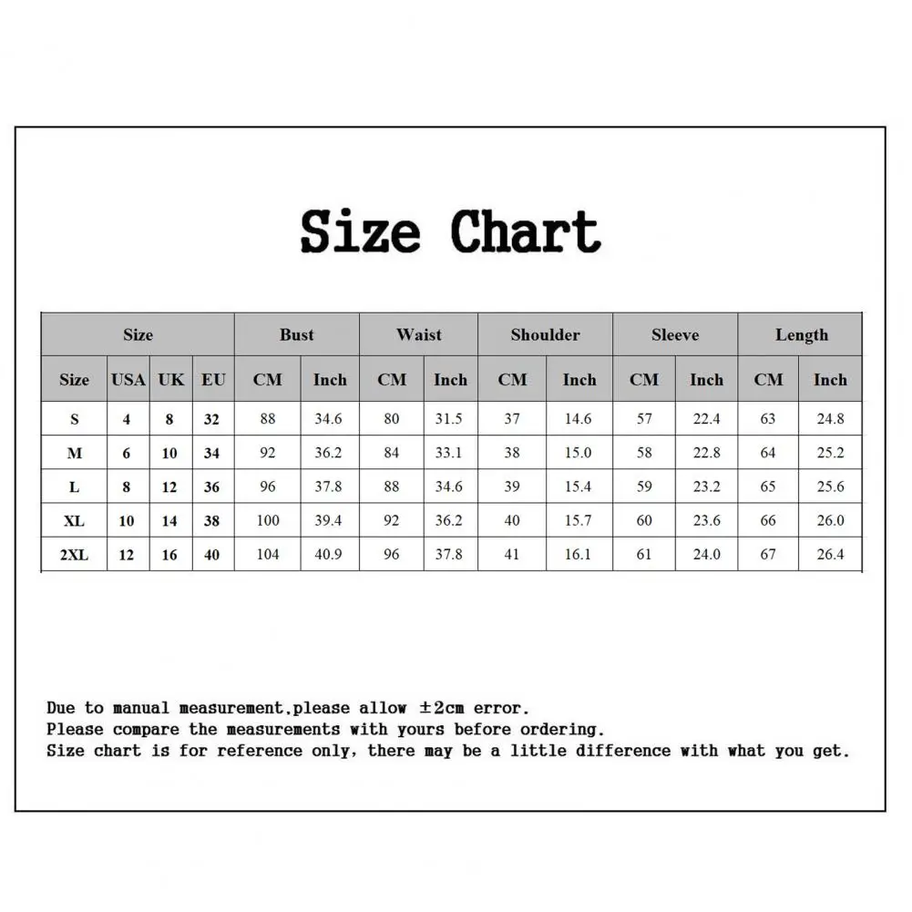 Size: XL, Bust: 100cm/39.4", Waist: 92cm/36.2", Shoulder: 40cm/15.7", Sleeve: 60cm/23.6", Length: 66cm/26" (Approx.)