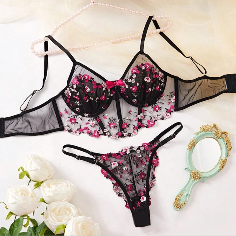 Sexy Bh Set Voor Vrouwen Bloemenborduurwerk Fee Lingeire Mesh Ondergoed Romantische Lingerie Exotische Bh Korte Sets Intieme Outfits quantity
