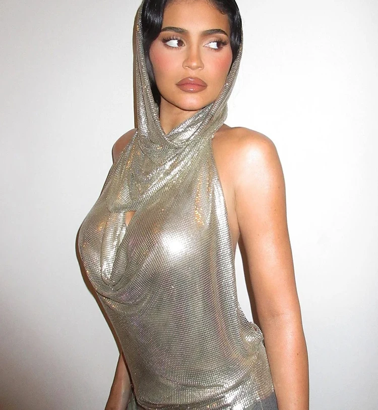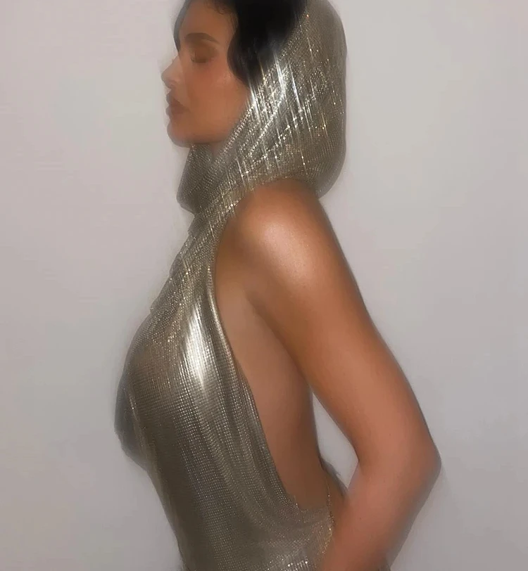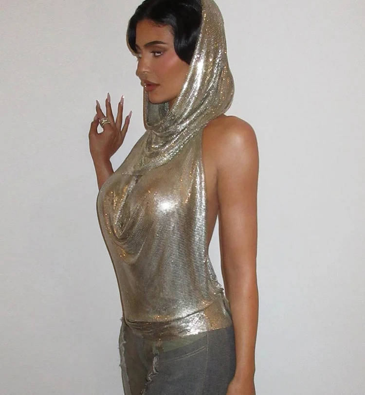/ Sexy Shiny Backless Tank Top Suit Women Halter Low Swinging Collar Indie Folk Silver-sequins Vest with Scarf High Street