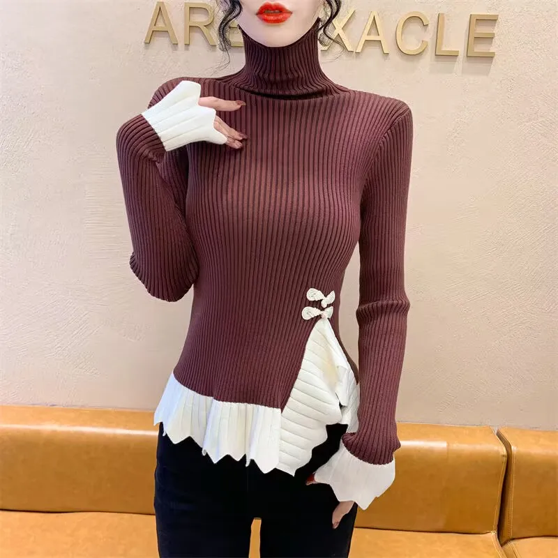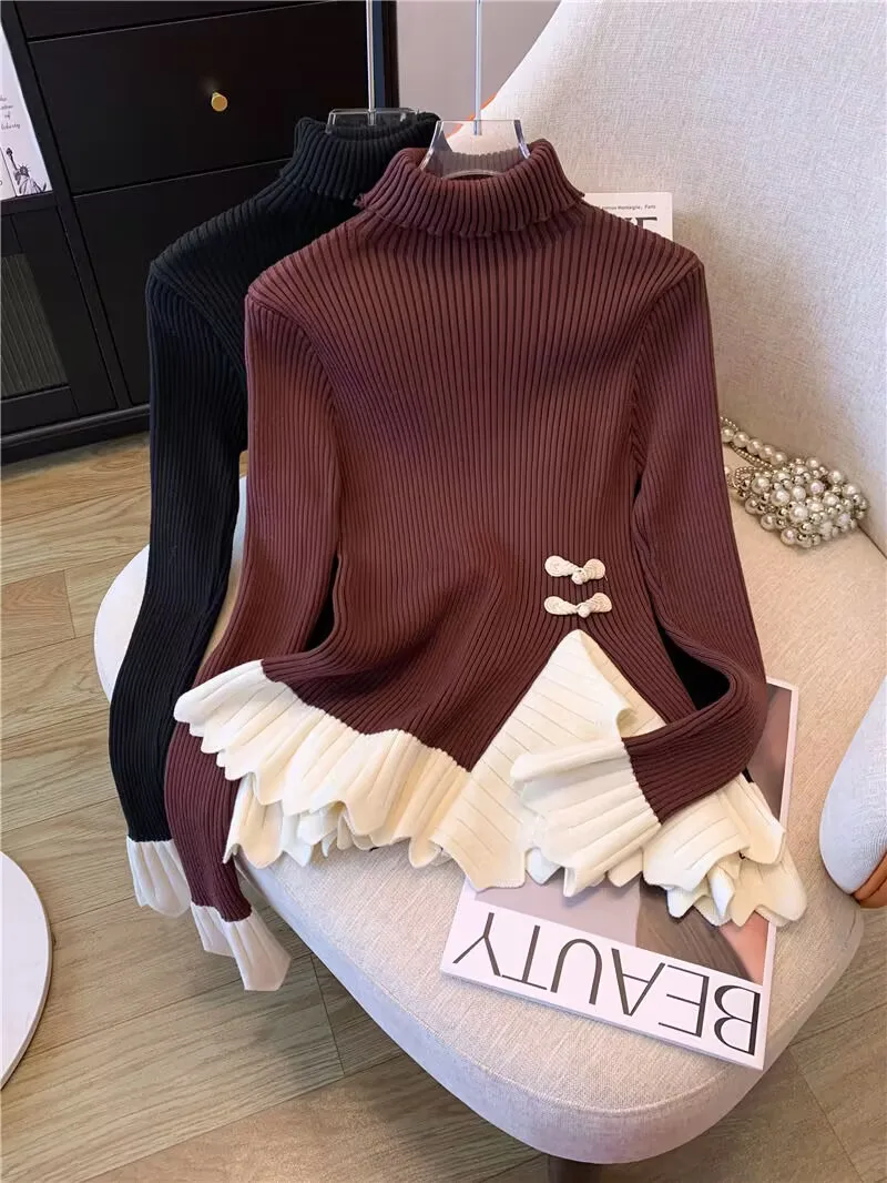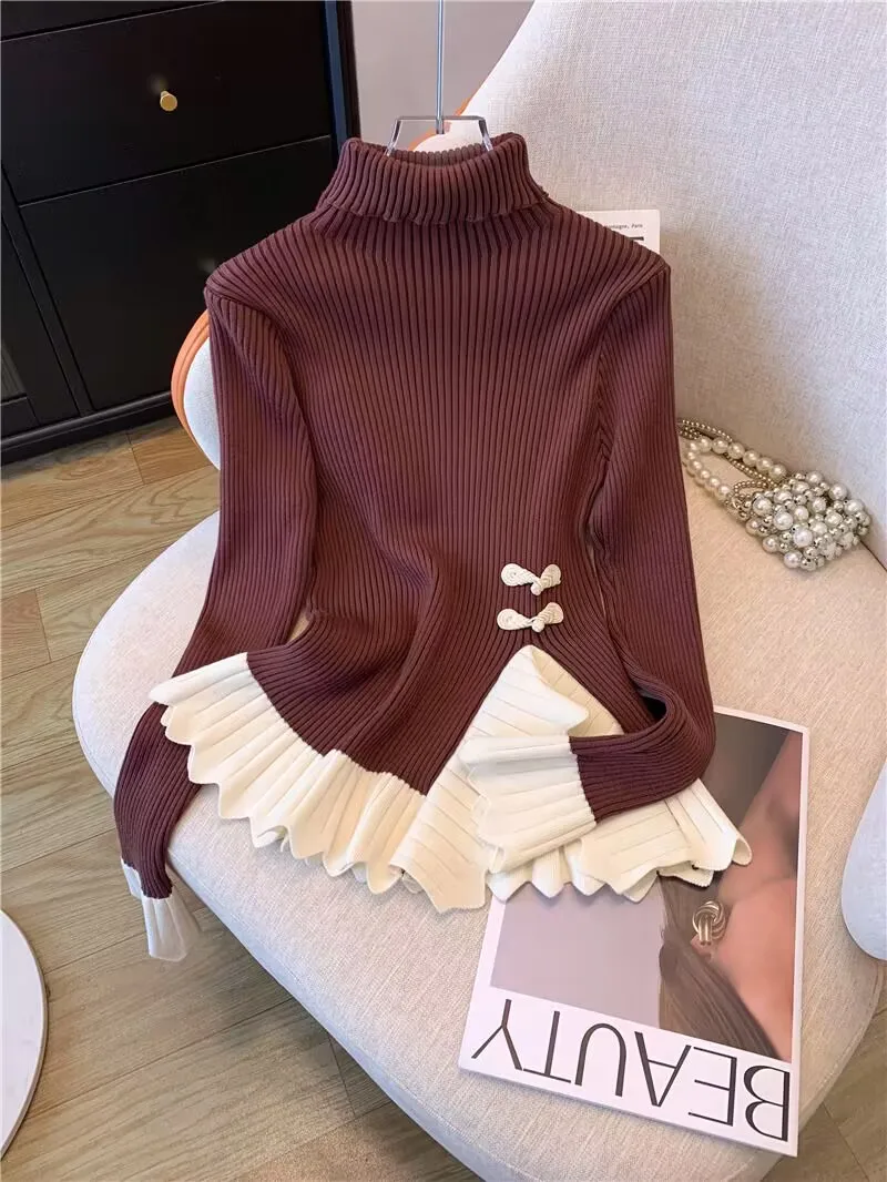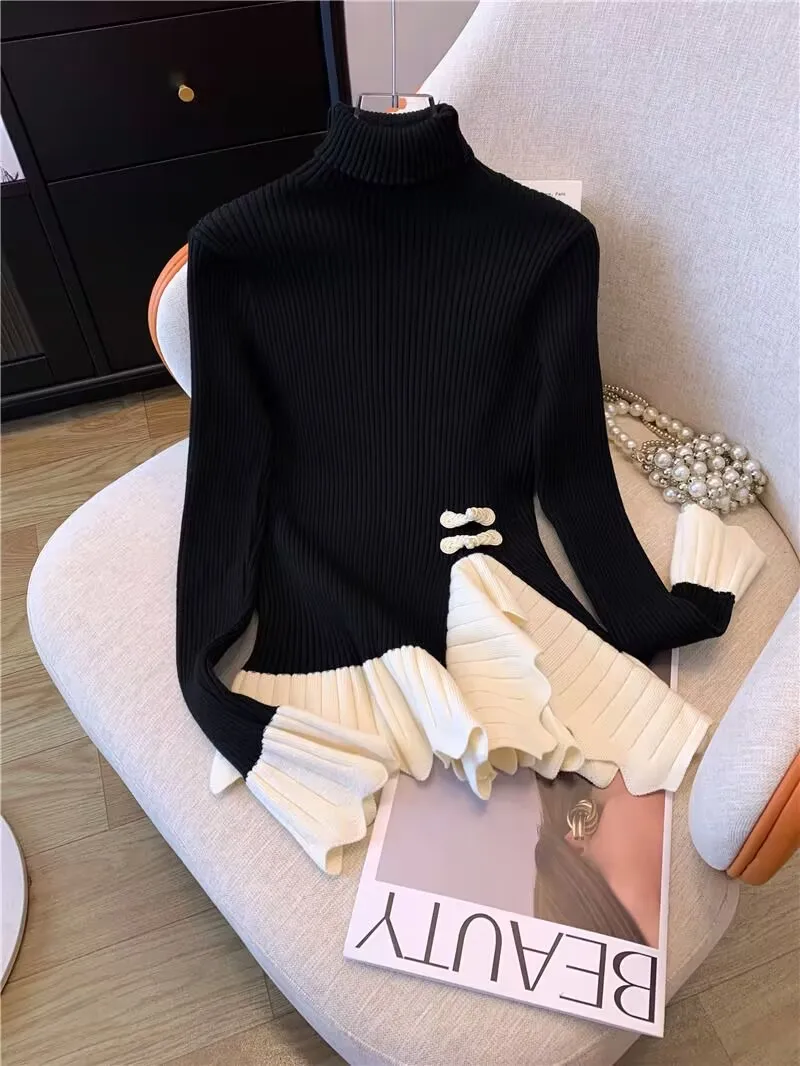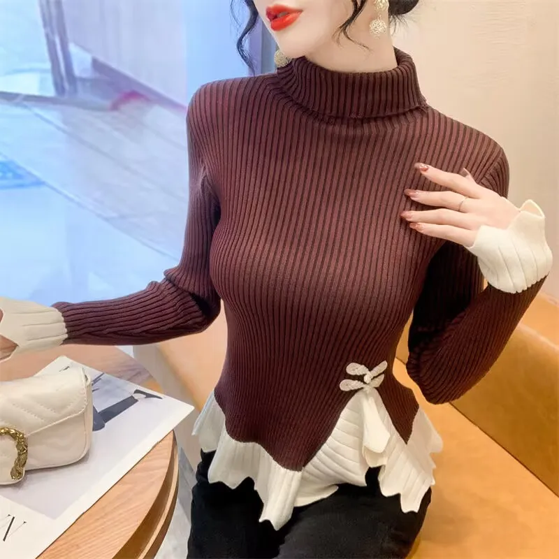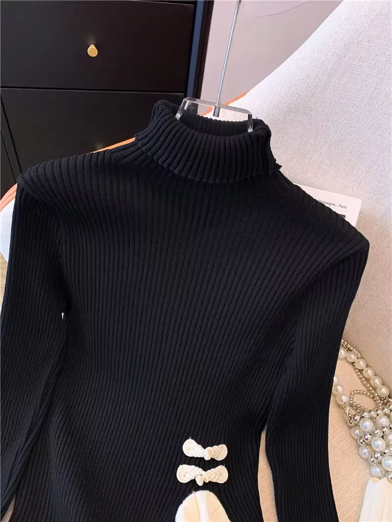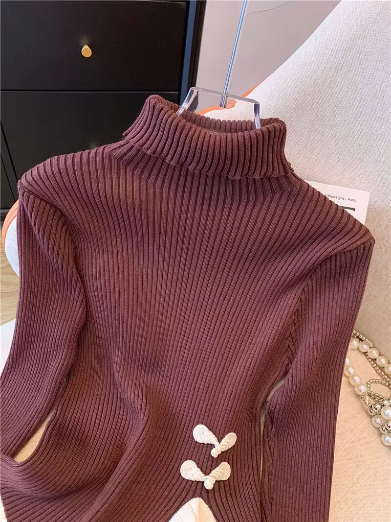 Vintage knoop knop gebreide trui nieuwe lente herfst elasticiteit slanke coltrui lange mouw kantoor dame elegant shirt quantity