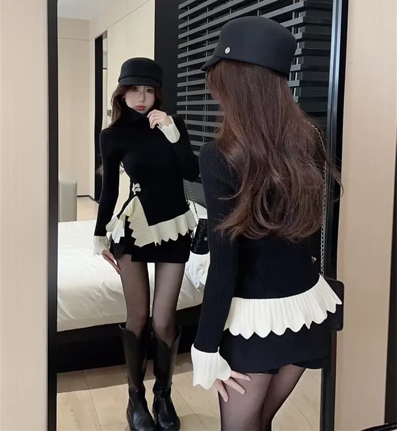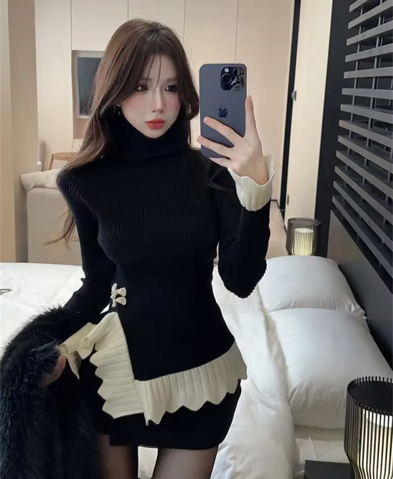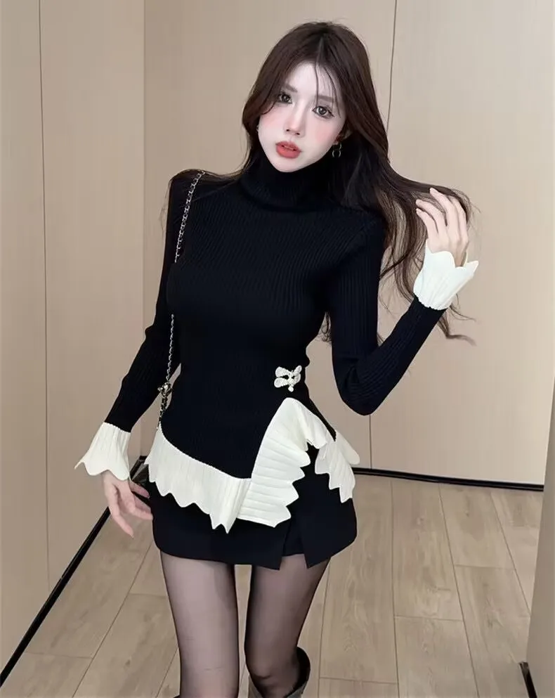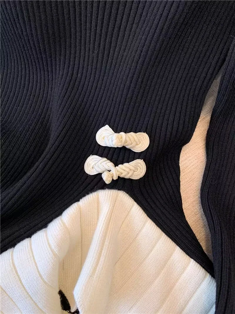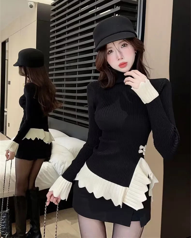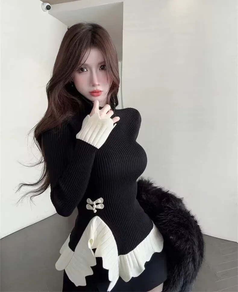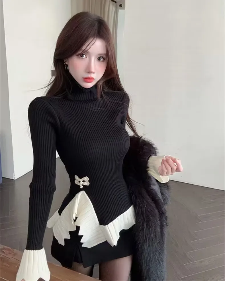Vintage knoop knop gebreide trui nieuwe lente herfst elasticiteit slanke coltrui lange mouw kantoor dame elegant shirt quantity