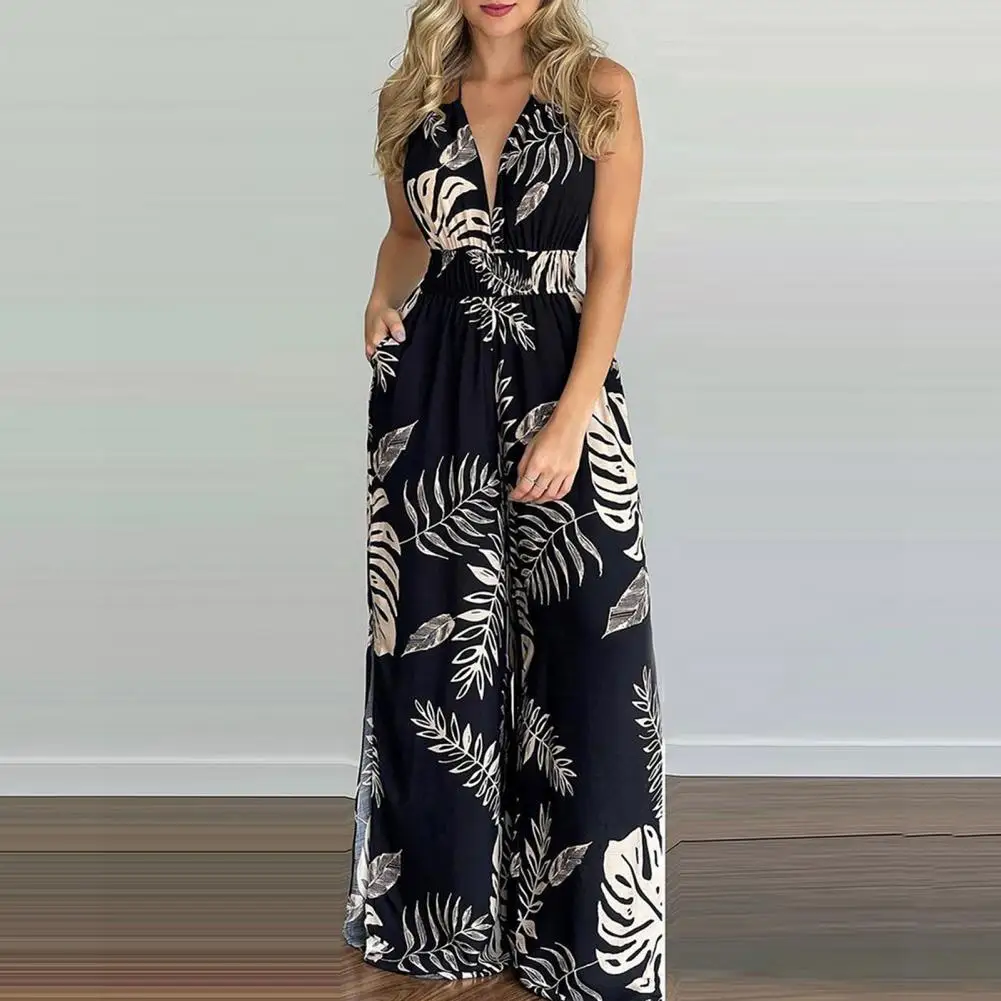 Sexy Vrouwen Jumpsuit Mouwloze Bloemen Boom Print Wijde Pijpen Spleet Zoom Backless Halter Losse Romper Overall voor Party